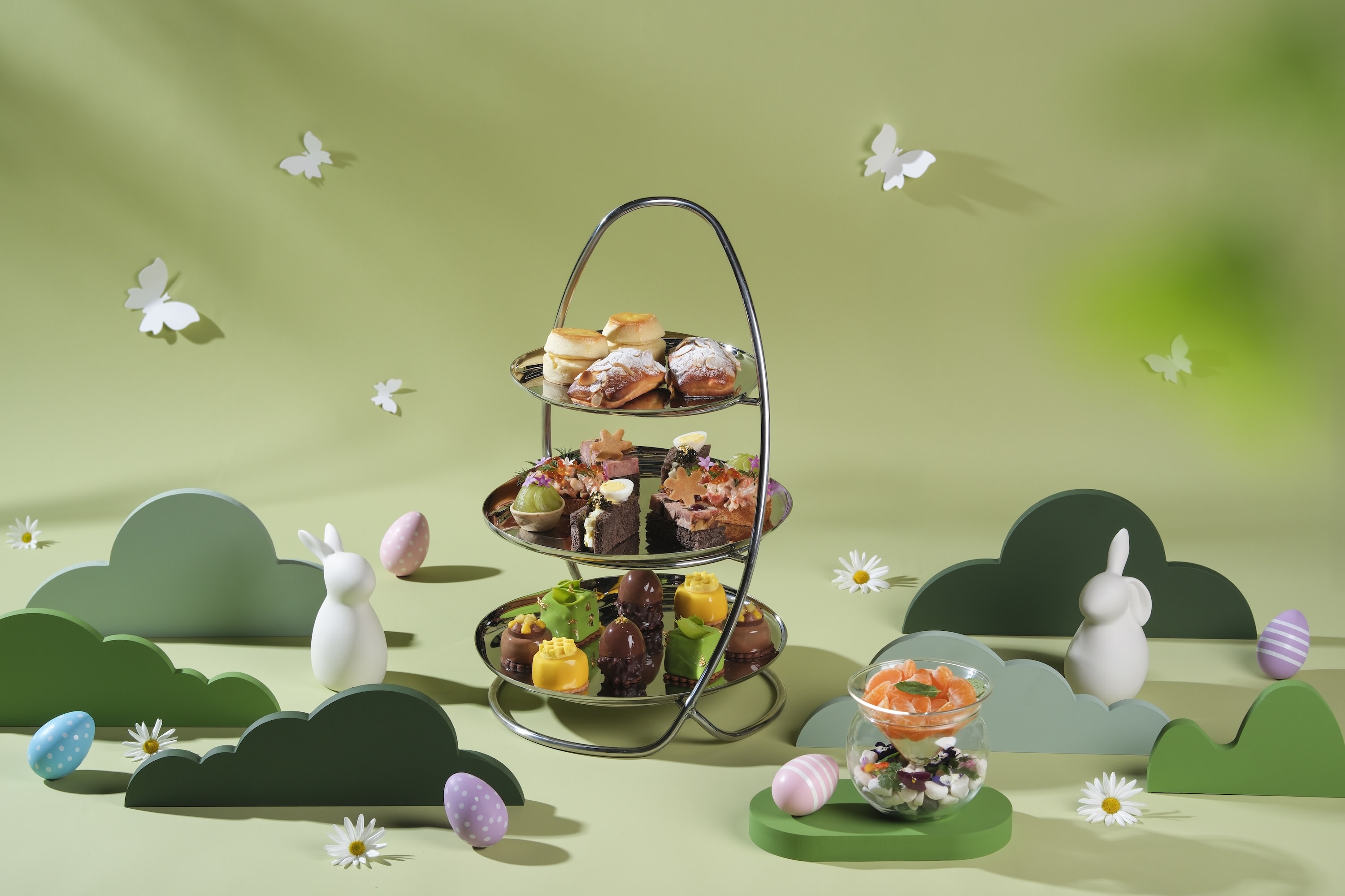 下午茶美點優雅盛放於耀眼銀色三層架,每一層宛如藝術品般呈現,捕捉春天的詩意。 堂食餐牌 外賣餐牌 # 繽紛復活節下午茶 (2026年4月4日至2026年4月7日) 今個復活節,誠邀您與摯愛親友蒞臨大堂茶座,細味節日限定的繽紛復活節下午茶。廚師團隊匠心打造多款鹹甜美點,包括復活節雞蛋沙律三文治配魚子醬及金箔、香濃朱古力蛋等,每一道皆融合創意與節慶喜悅,為您締造甜蜜歡欣的悠閒午後時光。 堂食餐牌 外賣餐牌