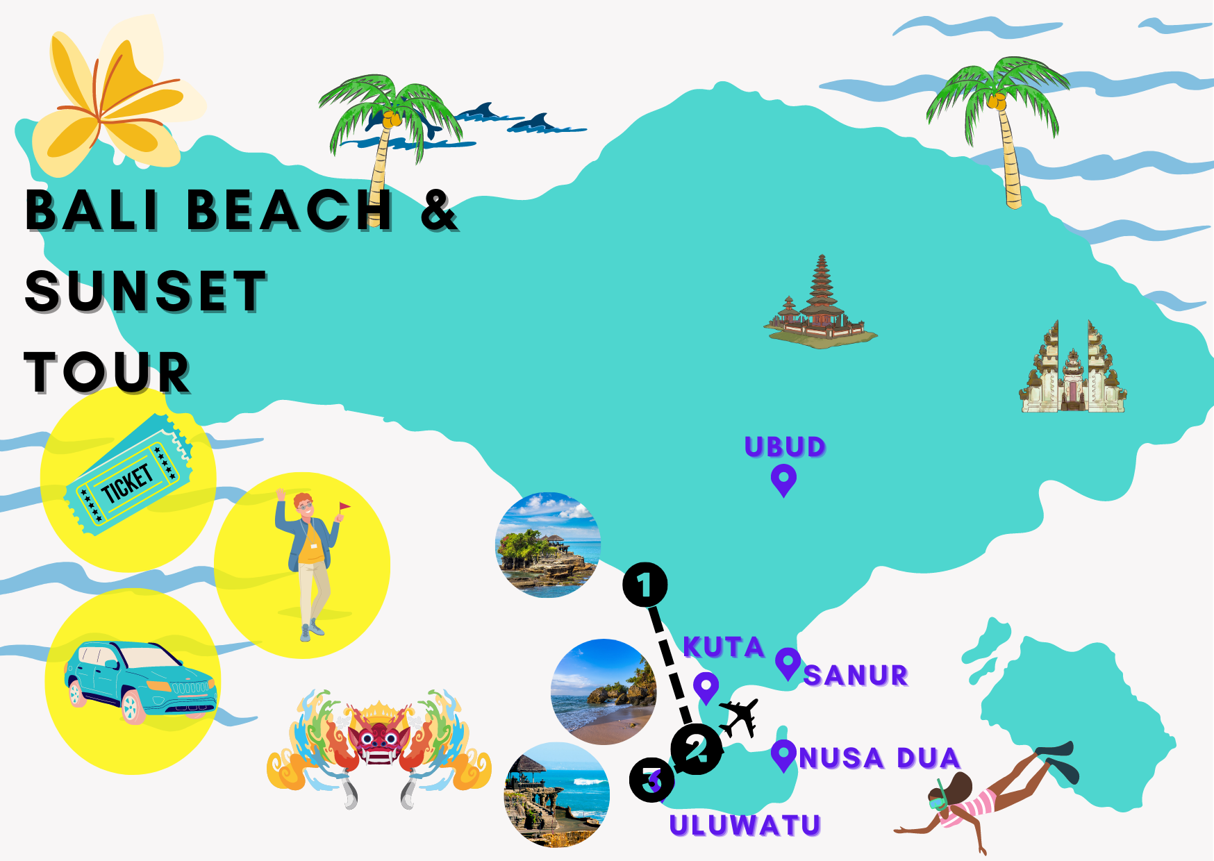 這行程其實幾個景點煮十分值得去,如海神廟、Padang Beach, Kecak dance… 但是由Jimbaran酒店根本不能用半小時到達海神廟⋯ 十一點前才到達,比想像的還要塞車。由海神廟到Padang Beach, 又使用了叻外一個半小時。在沙灘只可以逗留十分鐘要趕去買火舞的門票。買門票要到烏魯瓦圖廟由三時等待到四時多才可以買到門票。全場滿坐,但等候的位置得熱和曬。Kecak dance大概一小時,但大概要用兩小時等候。司機Putu人很好,幫影相買門票實在辛苦。中間要留意廟中的猴子,曾搶走我手上的手機和我太太的太陽眼鏡。幸好,手機可以取回(記得找工作人員),但手機配件(保護貼及支架及殼)和太太的太陽眼鏡就損壞了,十分影響心情。那裡的猴子很壞。還有日落是很不錯的。